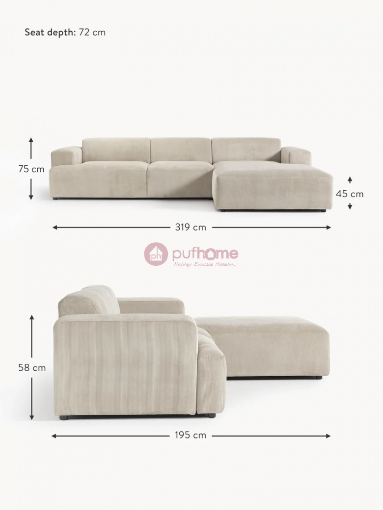 MELA 3 MODÜLLÜ L KOLTUK - VİZON FİTİLLİ KADİFE Ürün Ölçüleri